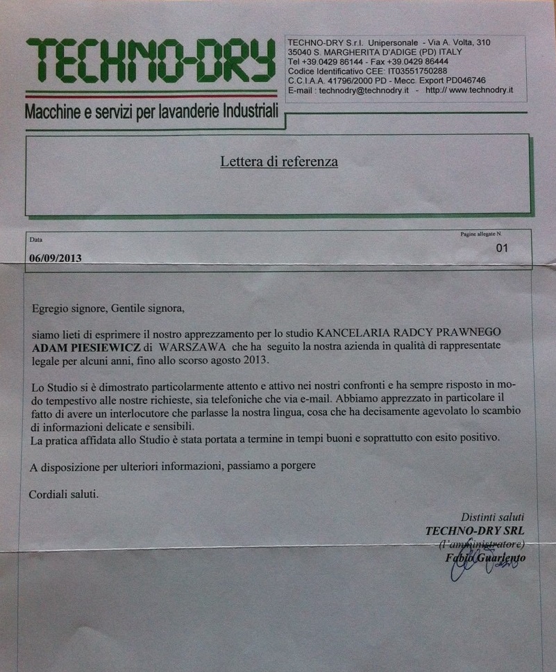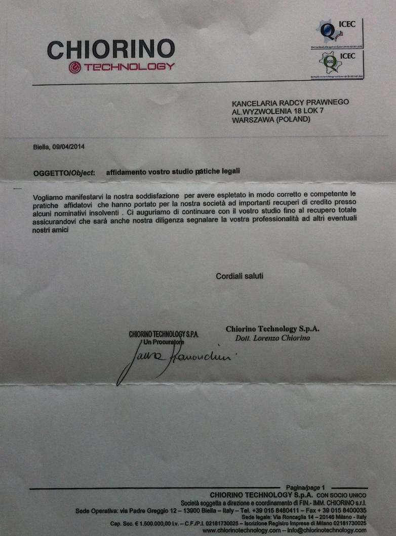 Chiorino S.p.A., D'Apollonia S.p.A., Ferrarini S.p.A, Gruppo Calzedonia, Gruppo Publitour S.p.A (Planet Sp. z o.o., Euro Planet sp. z o.o.), GPP Poland Sp. z o.o., ITI Arredo S.p.a., Italmex S.p.A. Import-Export, Moltra Sped S.r.l., Officine Metalmeccaniche Cornaredo S.r.l., Przedsiębiorswo Komunikacji Samochodowej w Bydgoszczy Sp. z o.o., Roberto & Franco Sp. z o.o., Senatrans S.c., Sitech Sp. z o.o., Solari di Udine S.p.A., Techno dry S.r.l, Unione Artigiani Unionservice Lecco.
